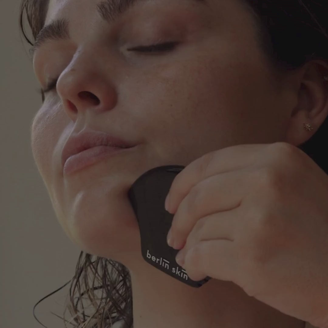 Lift: Gliding the small, flat side of the gua sha tool across areas such as your jawline, cheek, & forehead areas; this will aid in lifting + toning the facial muscles. Maintaining a light but firm pressure, at a 30-45 degree angle is key to maintaining optimal results in every stroke.